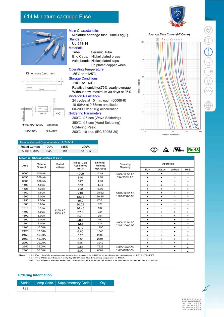 應(yīng)用領(lǐng)域: 614系列是高壓高分?jǐn)嗄芰ΡkU(xiǎn)絲,可以適用于交流電壓250V,分?jǐn)嗄芰π∮?00A的保護(hù)電路中, 614系列保險(xiǎn)絲適用于電信設(shè)備保護(hù)電路中。