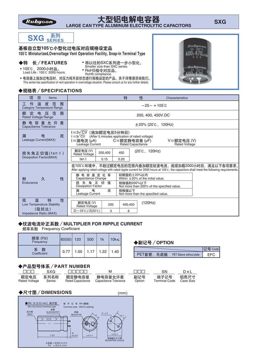 紅寶石RUBYCON大型鋁電解電容SXG系列