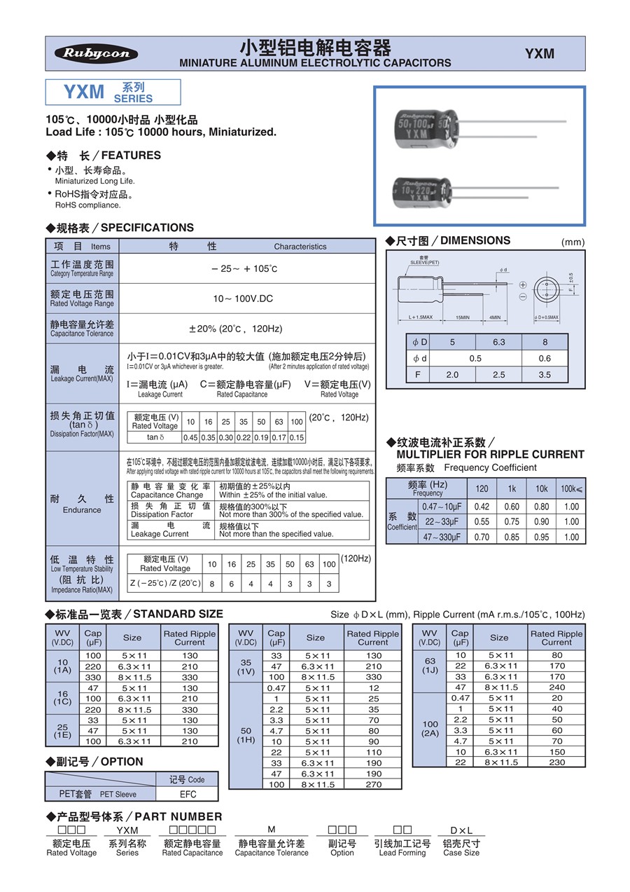 紅寶石rubycon小型鋁電解電容YXM系列