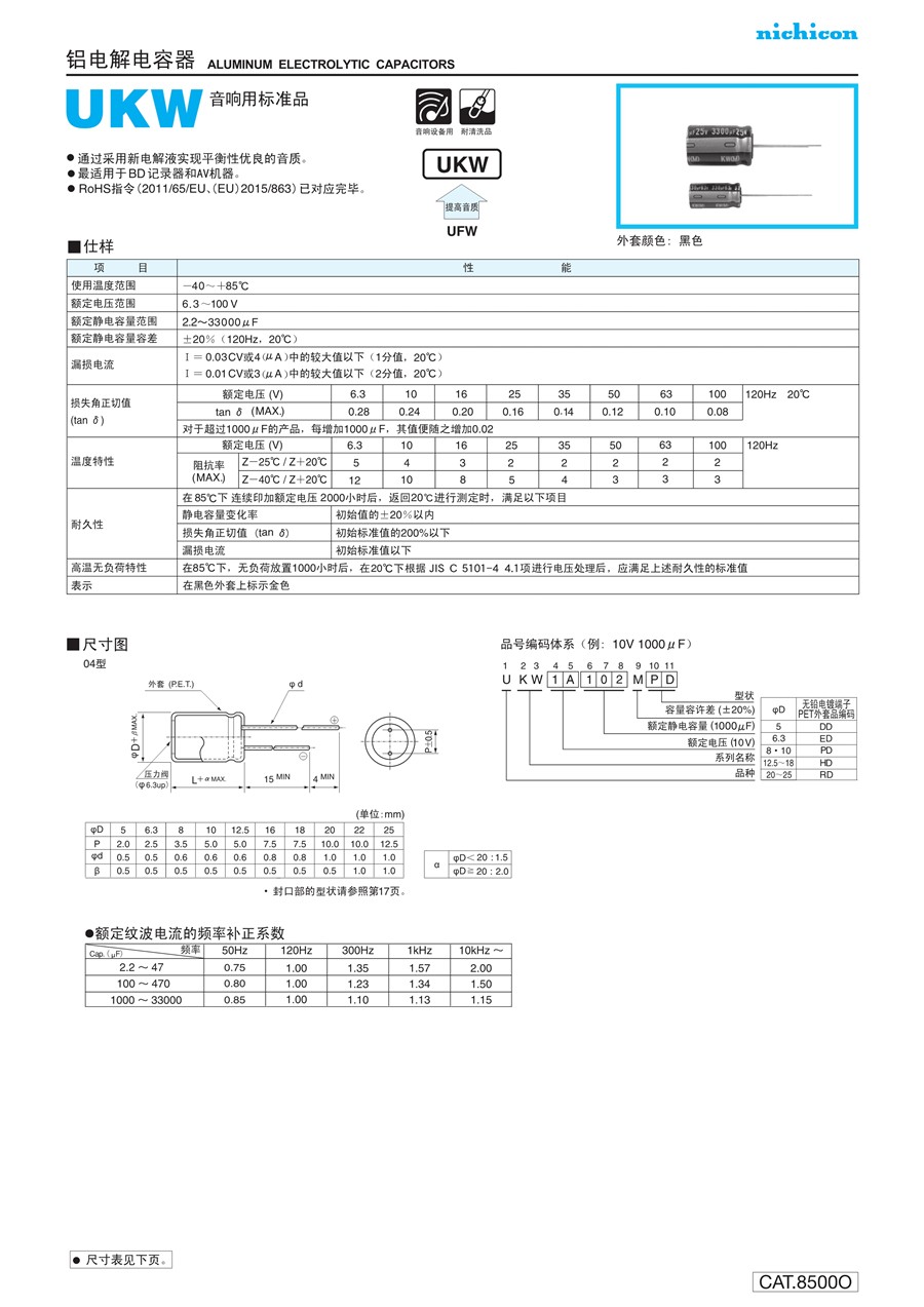 尼吉康nichicon小型鋁電解電容器引線型UKW系列