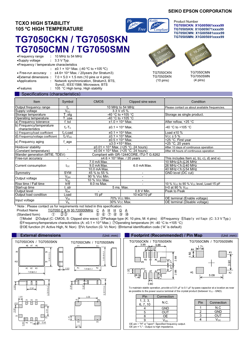 愛(ài)普生EPSON 晶振晶體振蕩器(SPXO)TCXO: 高精度晶體振蕩器TG7050CKN
