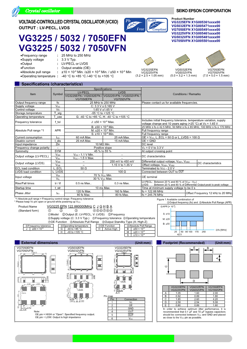 愛普生EPSON 晶振晶體振蕩器(SPXO)VCXO: 電壓控制震蕩器VG7050VFN