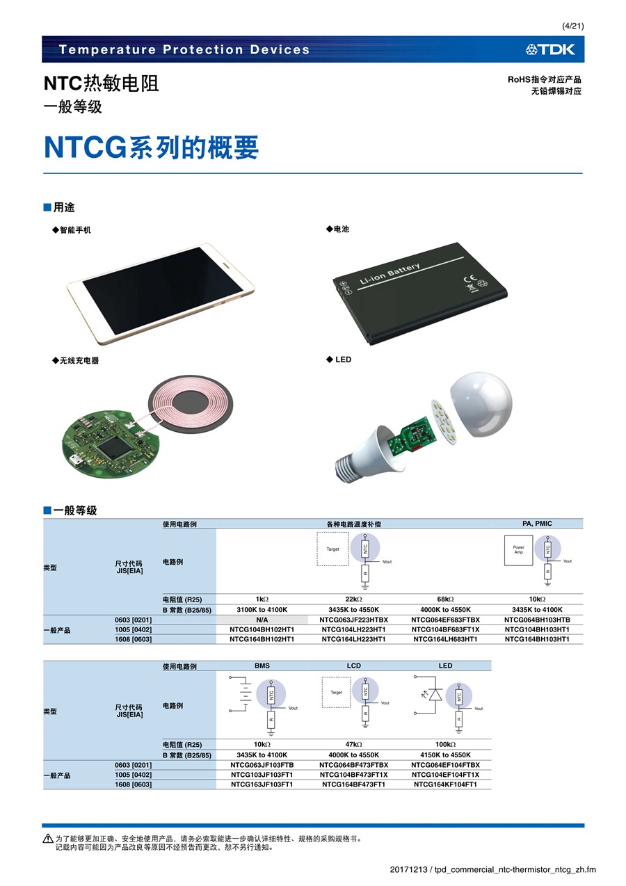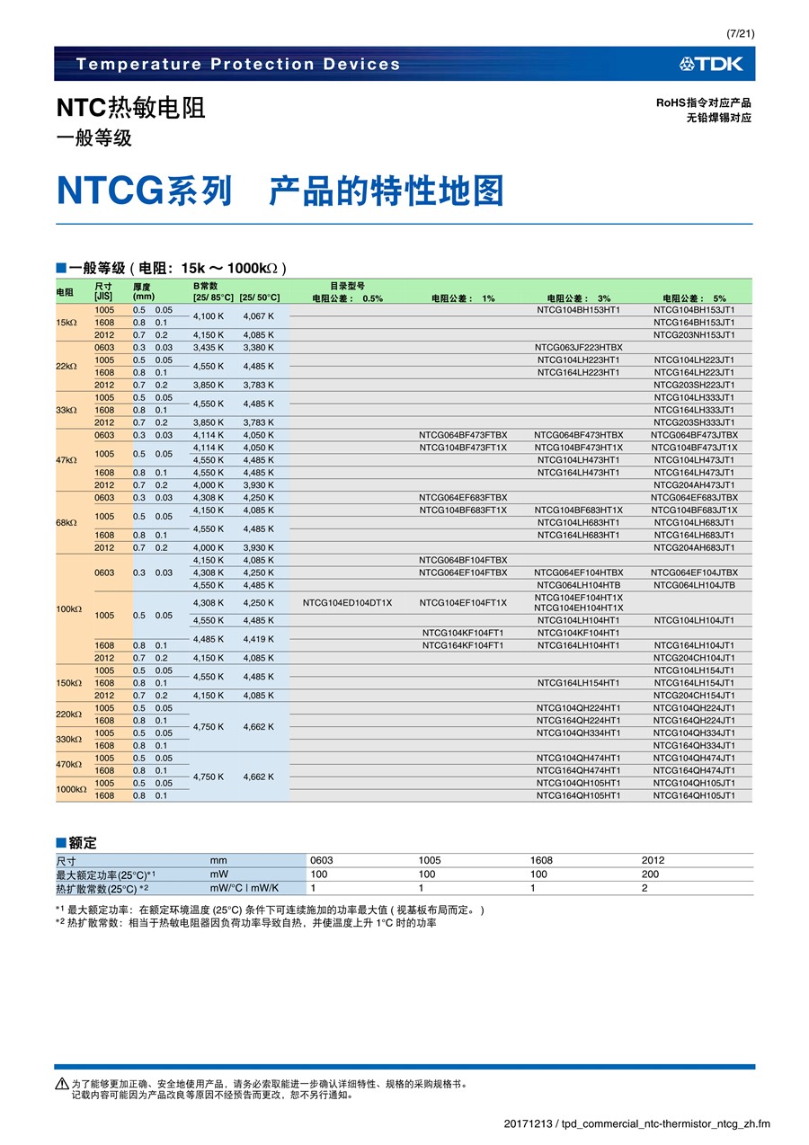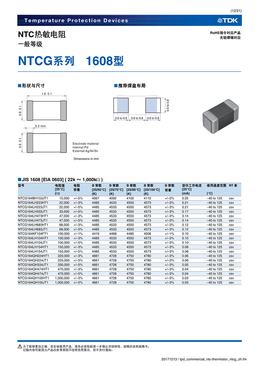 TDK貼片NTC熱敏電阻一般等級NTCG16