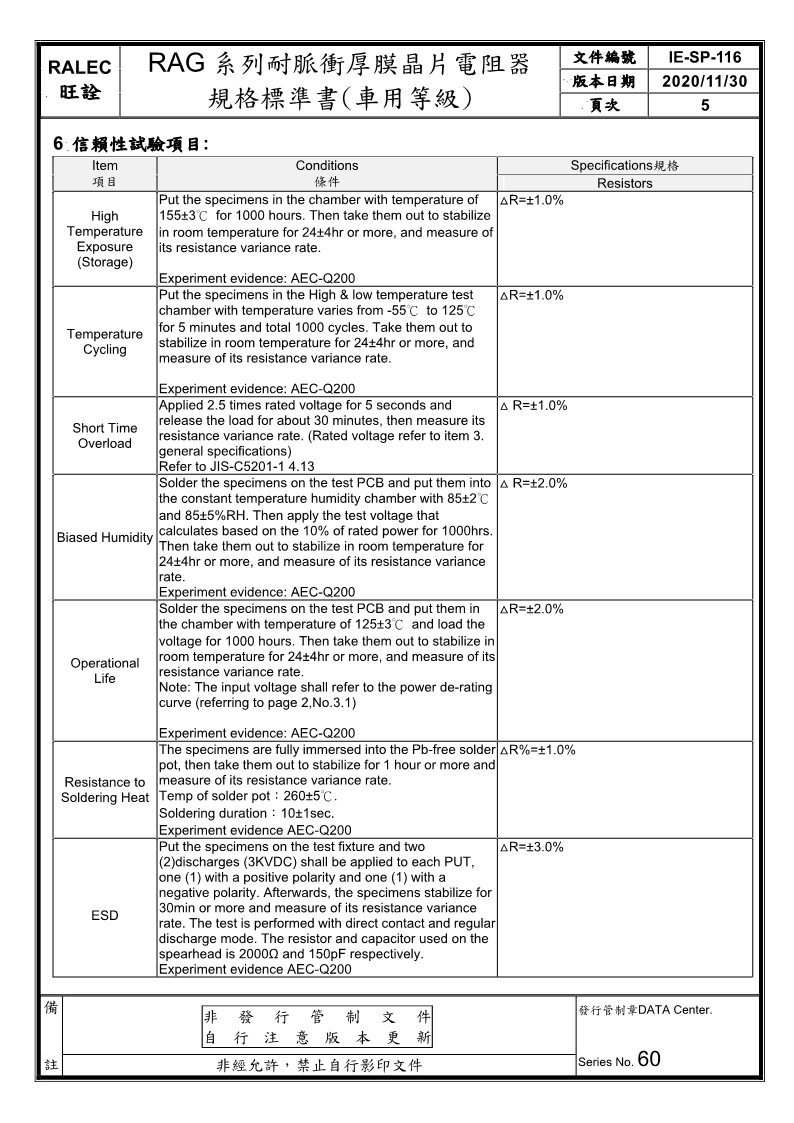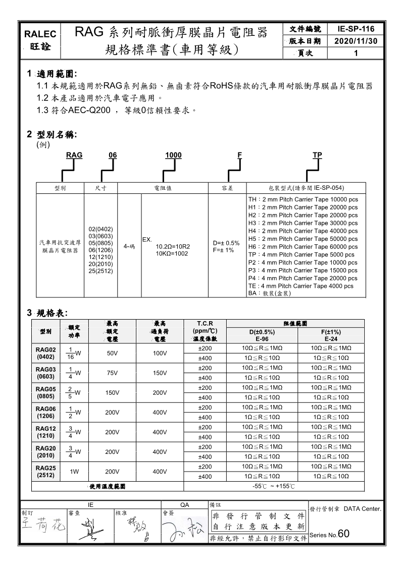 旺詮 貼片電阻車用等級(jí)芯片電阻車用金屬合金電阻RAG_Pulse Proof