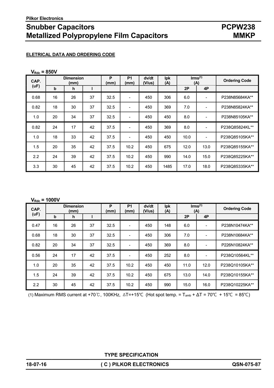 飛利浦PILKOR電力電子電容器(DC-Link,濾波器)PCPW 238