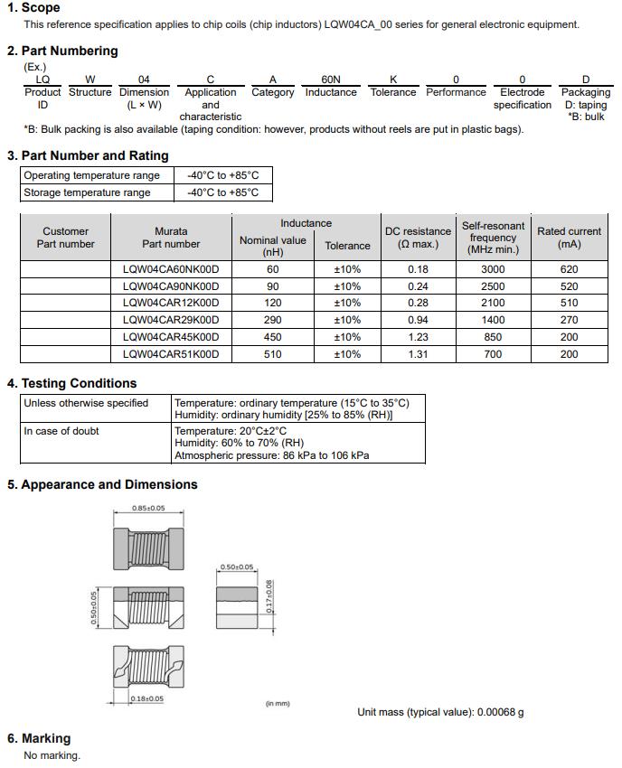 應(yīng)用領(lǐng)域:本標(biāo)準(zhǔn)適用于通用電子設(shè)備的片線圈(芯片電感)LQW04CA_00系列。