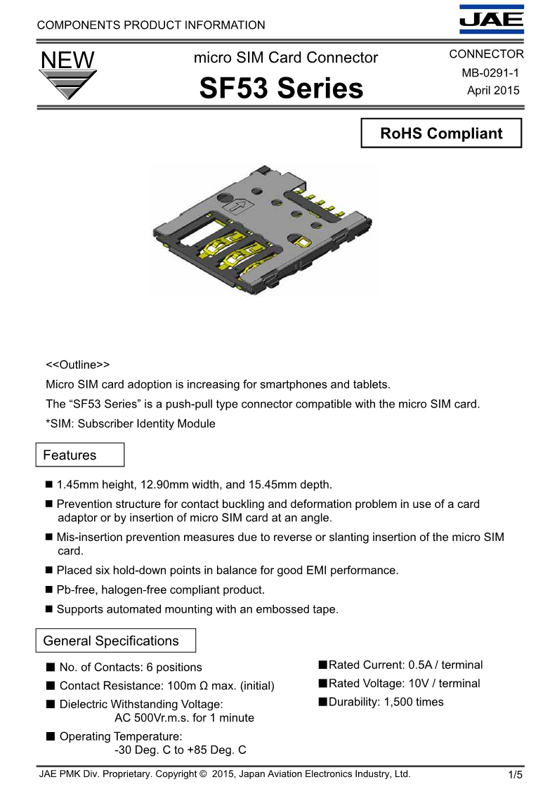 精密連接器 日本JAE連接器 記憶卡座連接器 SIM卡座 SF53 Series (Micro SIM Card Connector)
