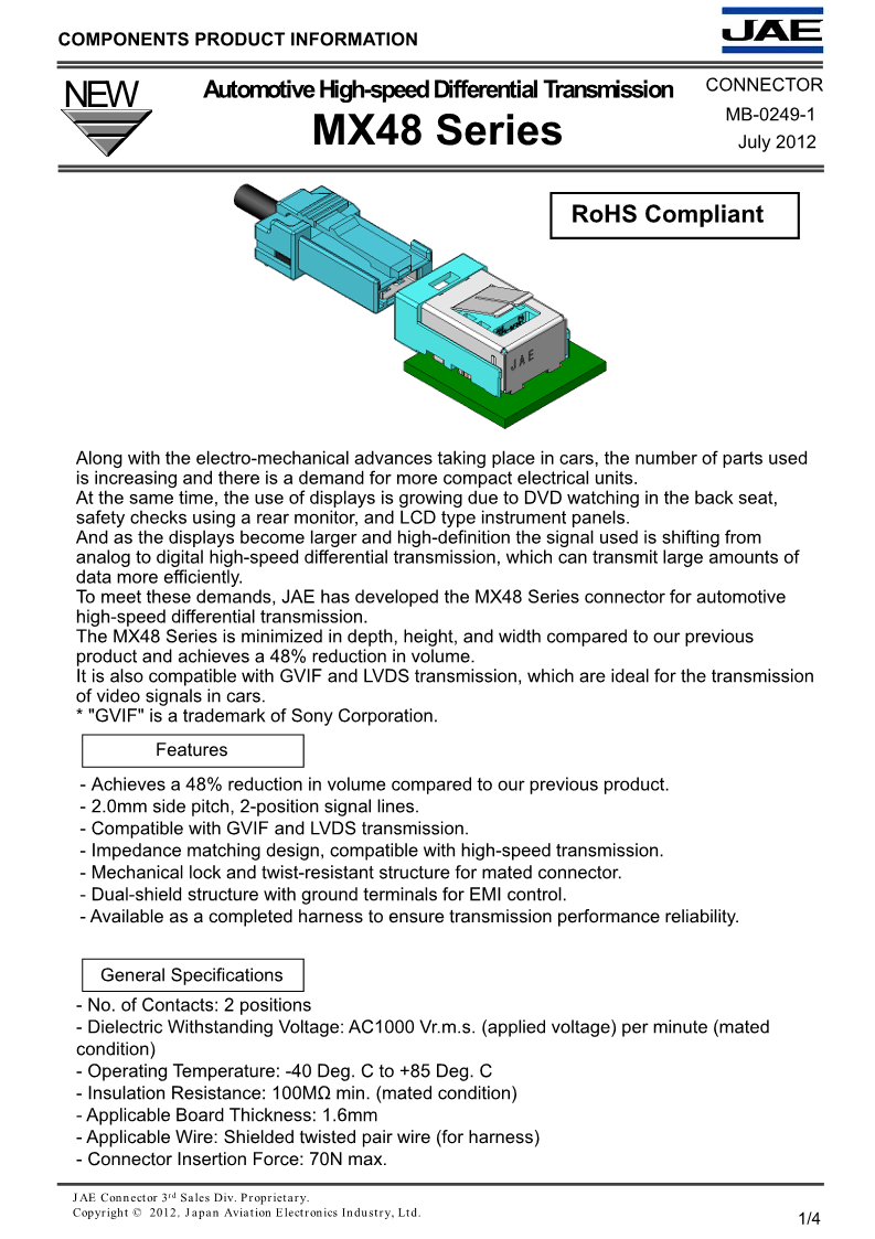 精密連接器 日本JAE連接器 外部接口連接器LVDS/GVIF MX48 Series (Automotive High-speed Differential Transmission Compatible Connector)