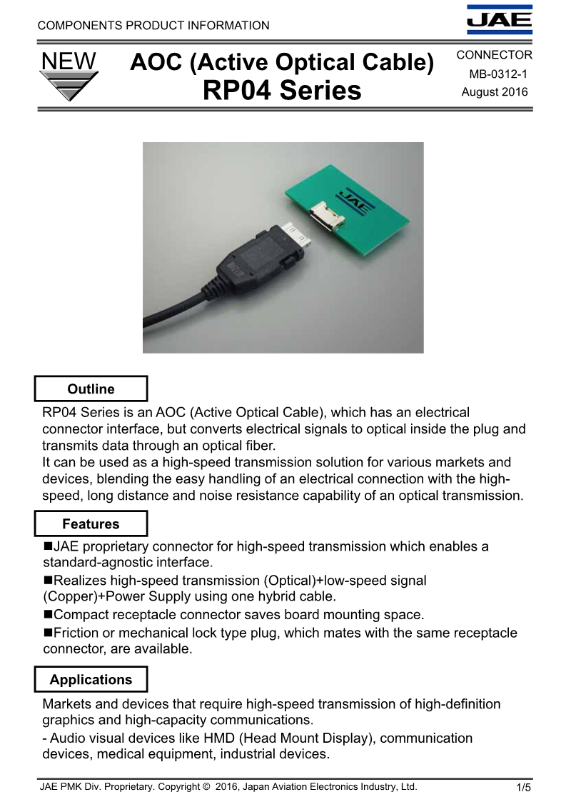 精密連接器 日本JAE連接器 外部接口連接器Others RP04 Series (Hybrid AOC for High-speed Transmission & Power supply)